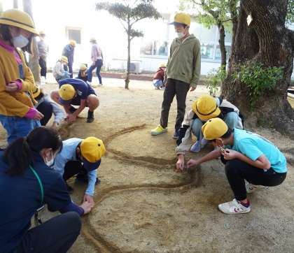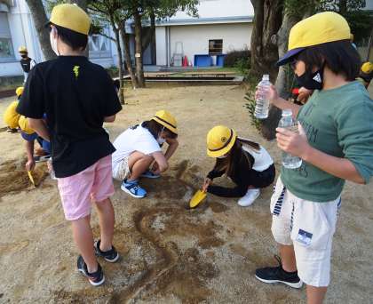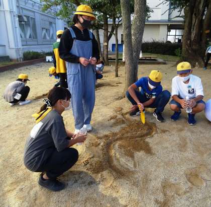 流れる水の働きについて調べるため、中庭で実験している様子です。