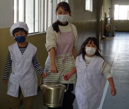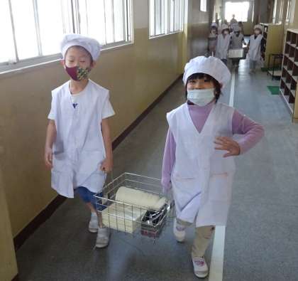 給食を教室まで運んでいる様子です。
