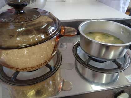 鍋でお米を炊き、かつおだしのみそ汁を作りました。