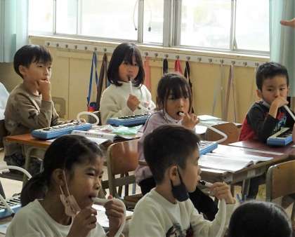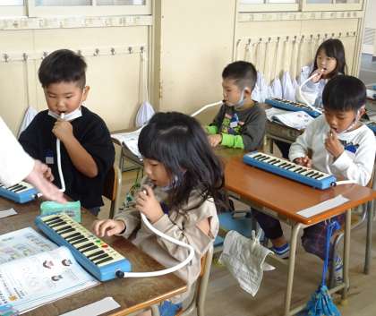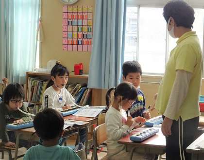リズムに合わせて鍵盤ハーモニカの音を出しています♪