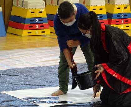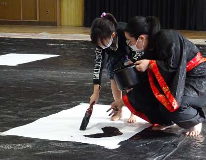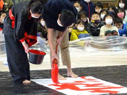 大きな筆を使って巨大な文字を書くことに挑戦しました。