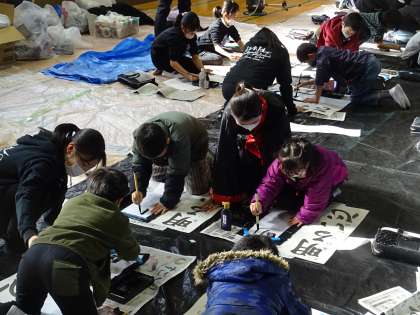 上宮高校書道パフォーマンス部の皆さんによる「書道教室」の様子です。