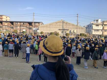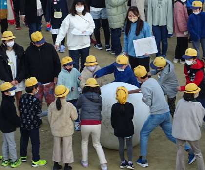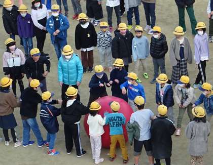 たてわり班が赤チームと白チームに分かれて、大玉を送ります。