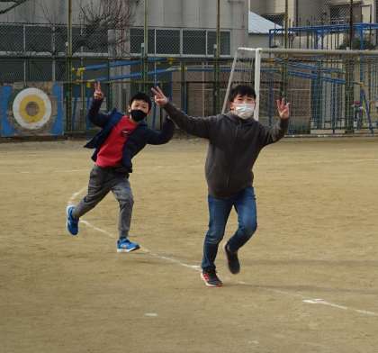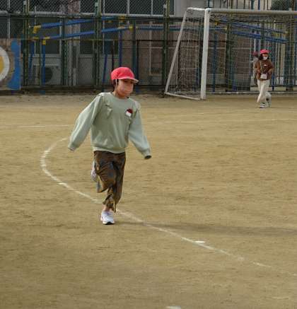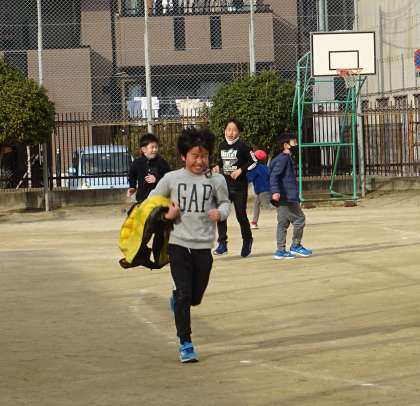 寒さに負けず、風にも負けず、がんばって走る子どもたち。