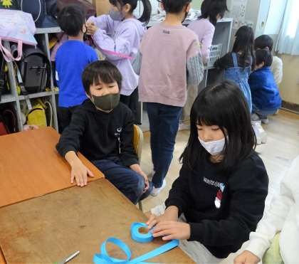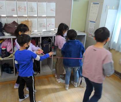 テープや自分の手の幅を使って、教室にある色々な物の長さを測っています。