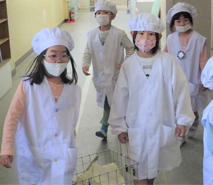 1年生は、5月から自分たちで給食を運びます。