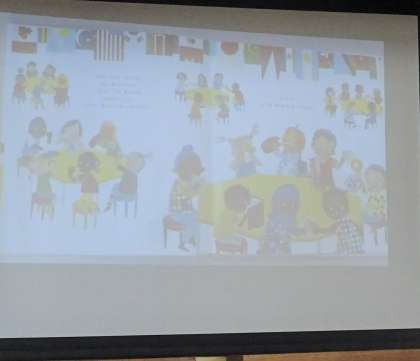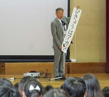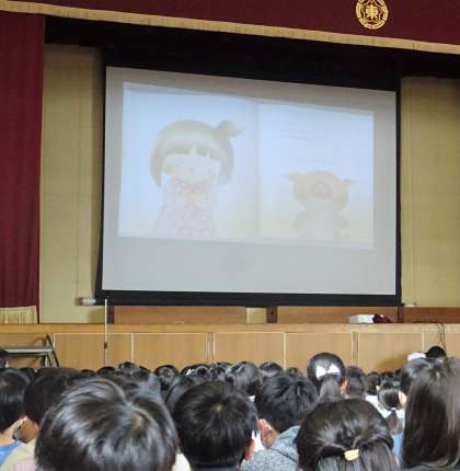 児童朝会では、校長先生から「ひきょうはアカン」という話があり、担当の先生からは2冊の絵本の読み聞かせがありました。