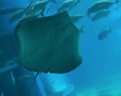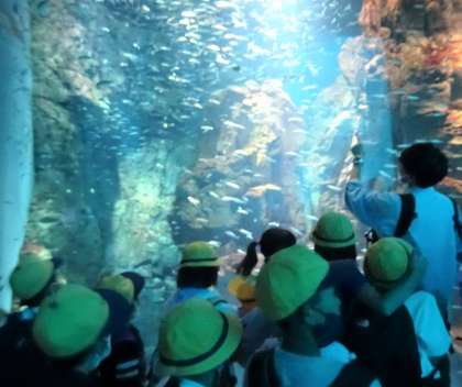 魚たちは、巨大な水槽の中をぐるぐる回って、お客さんにあいさつをしているようでした。