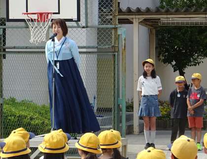 韓国・朝鮮の文化や日本とのつながりを教えてくれる民族講師(ソンセンニム)から、子どもたちにあいさつがありました。