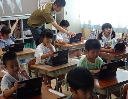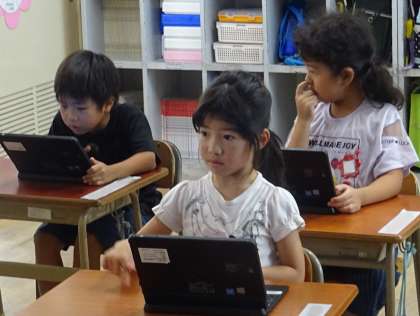 先生の指示を聞きながら、タブレットを操作している様子です。