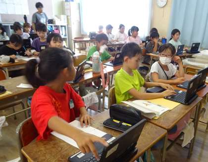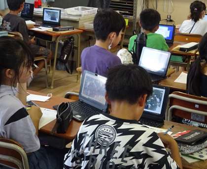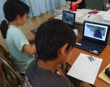 タブレットで撮影した草木の様子を改めて観察し、プリントにまとめている学習活動の様子です。