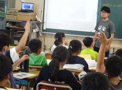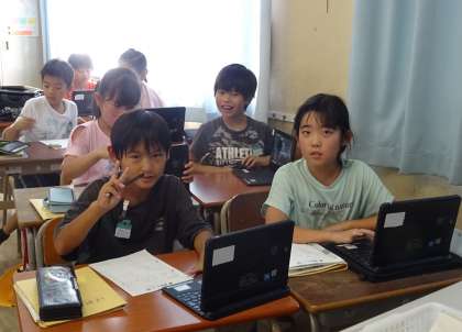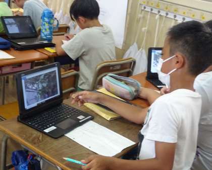 タブレットで撮影した草木の様子を改めて観察し、プリントにまとめている学習活動の様子です。