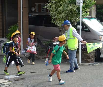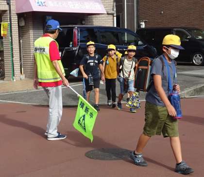 「見守り隊」の皆さんによる、通学時の見守り活動の様子です。