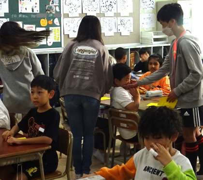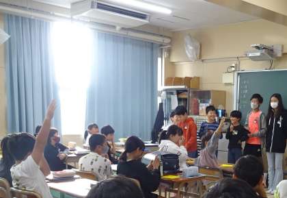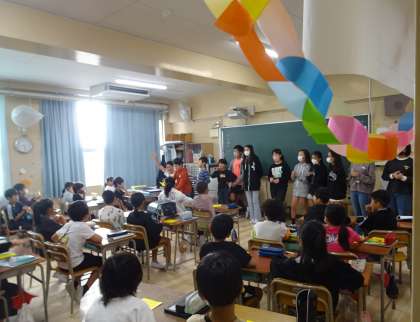 6年生が1〜3年生の教室を訪問し、折り鶴の作り方を教えてくれました。