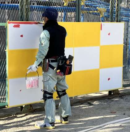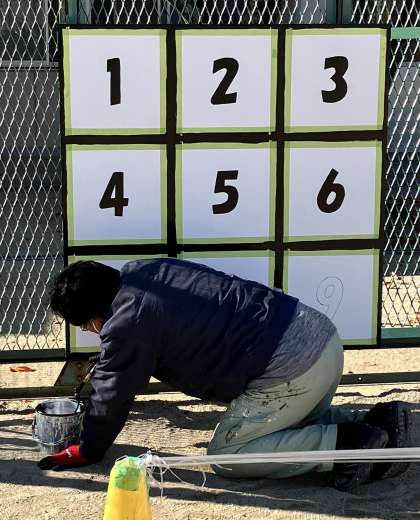 管理作業員さんらが共同作業で「ストラックアウト」と「キックターゲット」のボードを作製してくれています。
