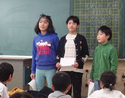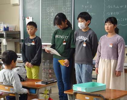 給食委員会の児童が各学級を訪れ、給食週間の取り組みについて、みんなに協力を呼びかけました。
