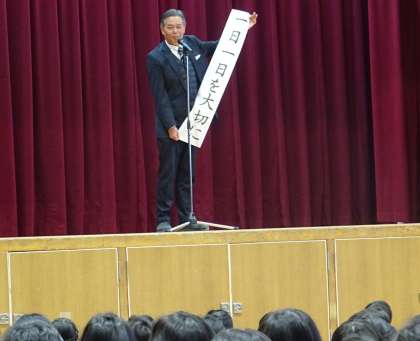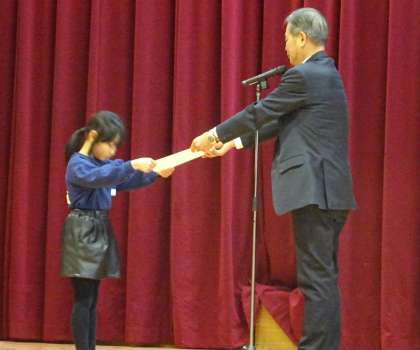 図工作品の表彰の後、児童会から「あいさつ運動」の取り組みについて呼びかけがありました。