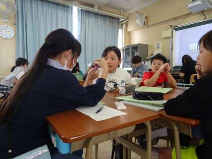 「ビオラの花の中はどんなつくりをしているのだろう?」と班ごとに虫眼鏡を使って詳しく観察しました。