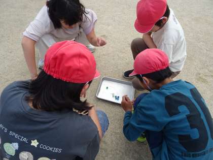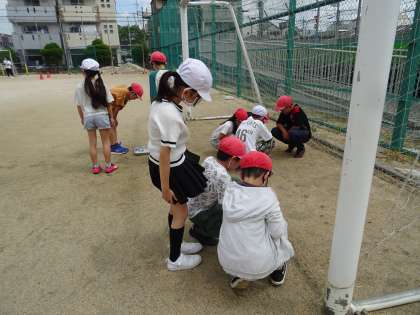 運動場でバットとビー玉を使って観察しました。