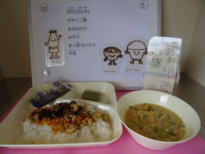 5月22日(水)給食(かやくご飯・みそ汁・まっ茶ういろう)