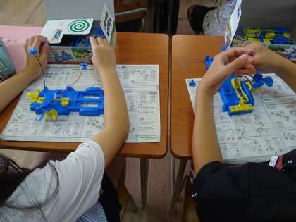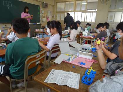 モーターカーを組み立てながら、乾電池を2本を使うつなぎ方について学習します。