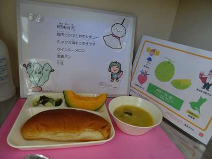 「クインシーメロン」という名前は、女王(クイーン)と健康(ヘルシー)を組み合わせて作られたと言われています。`メロン‘のオレンジ色の部分に多く含まれている「カロテン」という栄養素は、今日の献立に登場する`かぼちゃ‘にもたくさん含まれています。