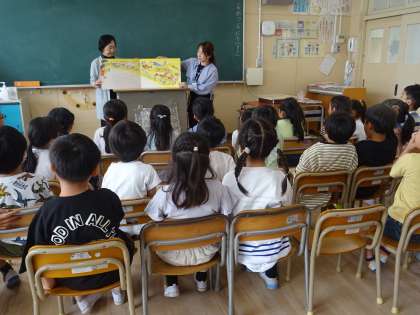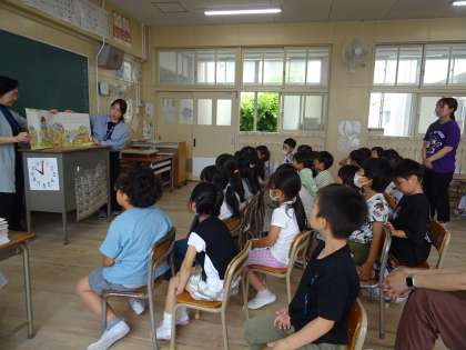 平野図書館ボランティア「たからばこ」の方に絵本の読み聞かせをしていただきました。大型絵本の絵とやさしい語りで、おはなしの世界に引き込まれていきます。