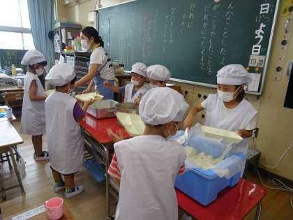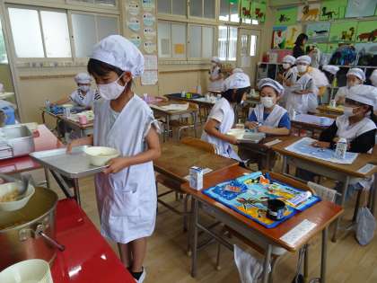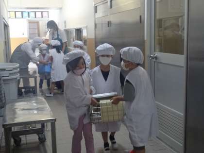 給食当番さんは「1・2」「1・2」と二人の息を合わせて階段を上っていました。