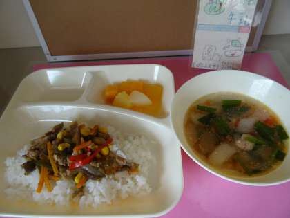 今日の給食は平野西小学校のみなさんが考え「学校給食献立コンクール」優秀賞に選ばれた献立です。だんじりを盛り上げるために、夏野菜をたくさん食べて体力をつけることができるように工夫し、お祭り気分を味わえるようにいろどりも考えたそうです。