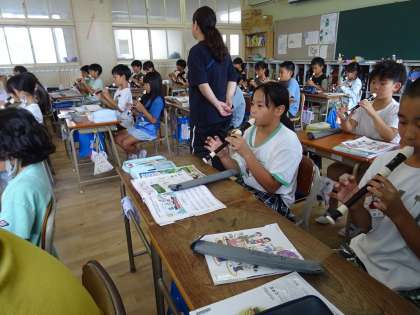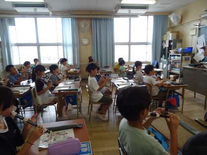 リコーダーで「陽気な船長」の曲を演奏しました。ド→レ→シ運指の難しい部分を何回も繰り返し練習したら、すぐにきれいにそろいました。