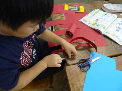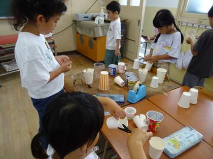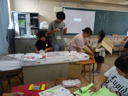 材料を選んだり、作り方を工夫したりして、自分だけのおもちゃを作ります。職場体験の中学生もお手伝いしてくれました。