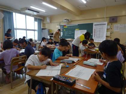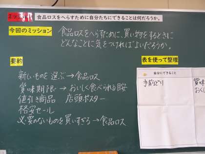 「食品ロスをへらすために自分たちにできることは何だろうか」買い物をするときに、どんなことに気をつければいいのか班で話し合いました。