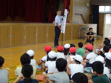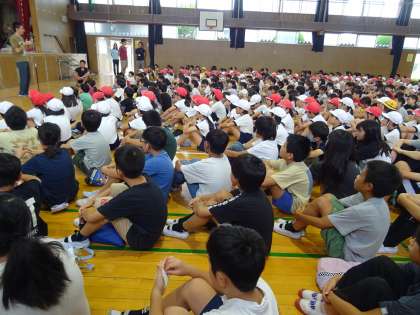今日は校長先生から「チームワークが一番」とお話がありました。「みんなが一人のために。一人がみんなのために」を心に、運動会の練習をがんばりましょう!今月の目標は「ものを大切にする」です。とても静かにお話を聞けていました。