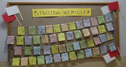 一人ずつ運動会のめあてを書いた旗を飾り付けました。