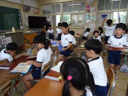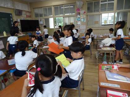 朝の風景です。配られたプリントをきちんと連絡袋に入れたら、すすんで係の仕事をしていました。