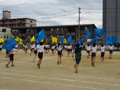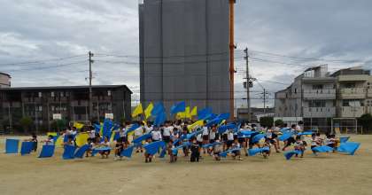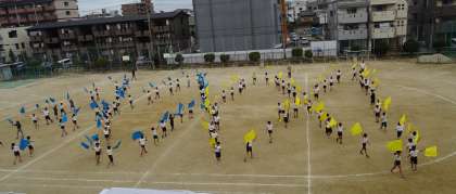 運動場にフラッグを翻す音が、きれいにそろって響いていました。演技している表情も、いきいきと輝いていました。