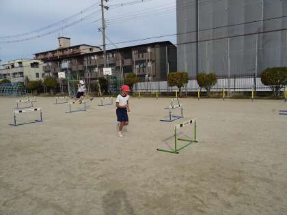 協力して準備をした後、先生にフォームのお手本を見せてもらい、三つの間隔別でハードルにチャレンジしました。