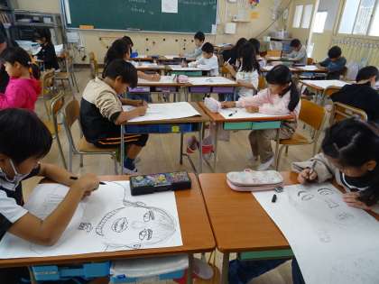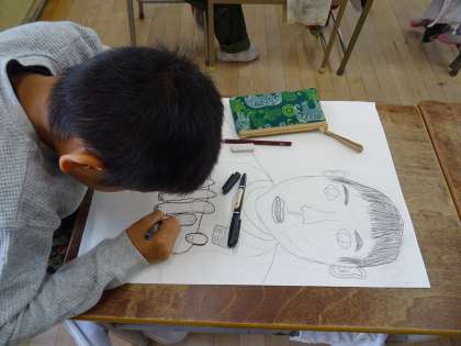 友だちと向かい合い、ペンを使ってしっかりと下絵を完成させていきました。