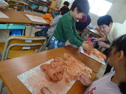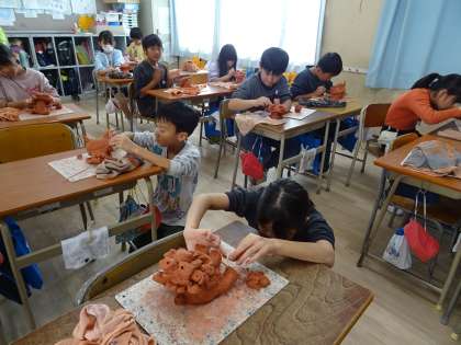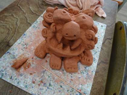 「シーサー」作りです。残った粘土でひげや角などを付け加えたり、すきまなくつるつるに仕上げました。