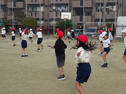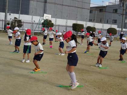 なわとびの上を前後左右にジャンプしてウォーミングアップしてから、前とび・後ろとび・あやとびの練習をしました。最後は大繩にもチャレンジしました。