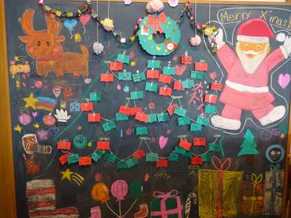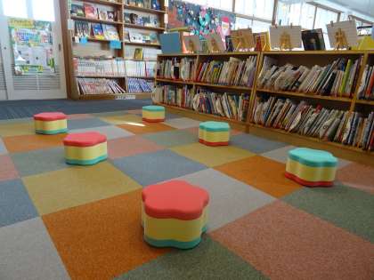 ツリーには子どもたちがおすすめの本の題名を書いた飾りが貼ってあります。絵本コーナーに新しくスツールが置かれました。