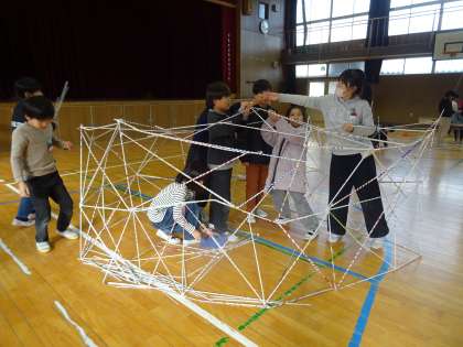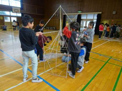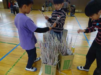 新聞のチラシを丸めたステッィクをセロテープでつなげて、思い思いに造形あそびを楽しみました。