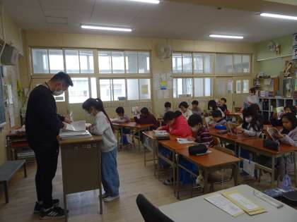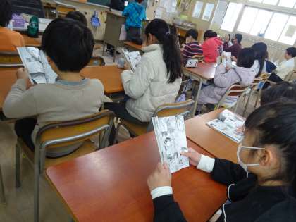 一人ずつ2学期がんばったところなど先生からお話を聞いて通知表を受け取りました。待ってる間は社会で学習した「中甚兵衛物語」を静かに読んでいました。