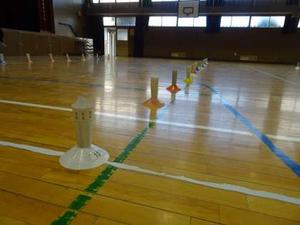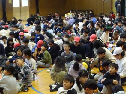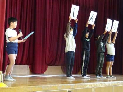 集会委員は解答用紙を、たてわり班ごとにきれいに並べて準備しました。今日は文字カードを並びかえて言葉を作る『ゲーム集会』をしました。