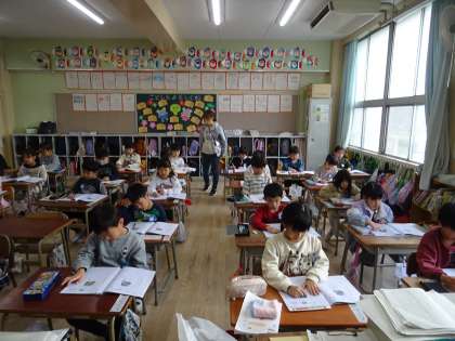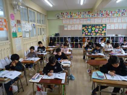 新しく習った漢字の筆順と漢字を使った文をみんなで確認してから『かんじ学しゅうノート』で練習します。