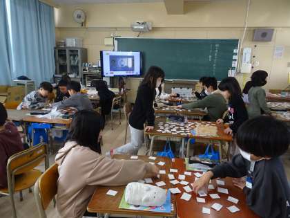 形と色を合わせるカードめくりゲームをしました。形と色を英語で言って確認しながらゲームができました。