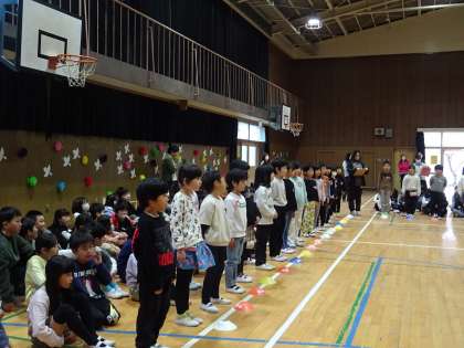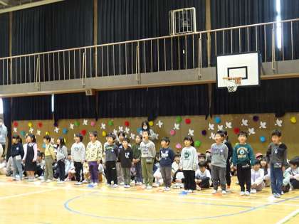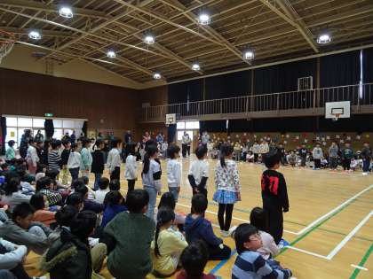 たてわり班で並んで1年生から順に呼びかけの練習をしました。明るい声が講堂に響いていました。