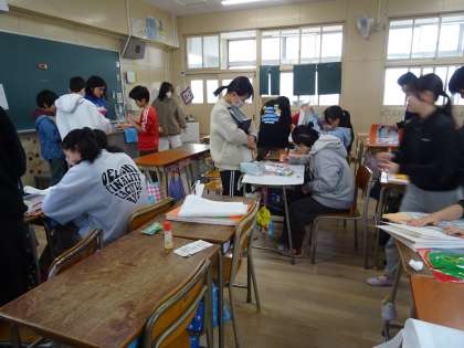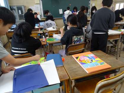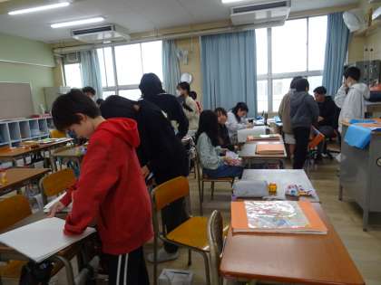 1年間の作品を製本して表紙を作っていました。卒業式まであと1週間のひとときを惜しむような和やかな雰囲気です。