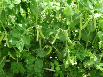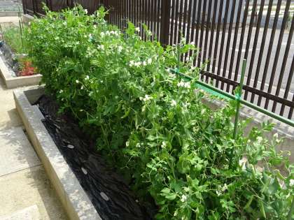 スナップエンドウの白い花が咲き、実がたくさんつきました。