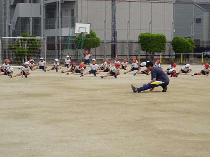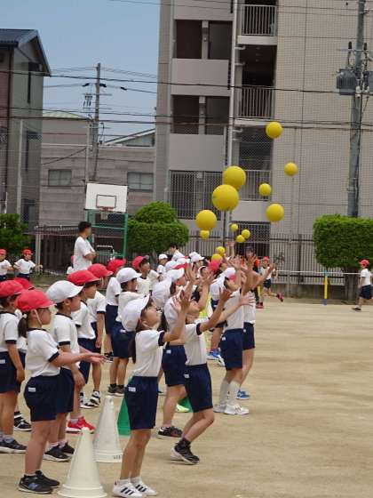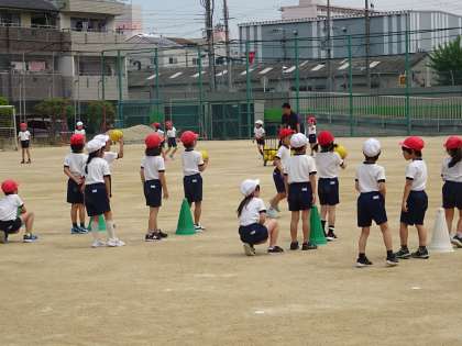 ボールを頭の上に投げてキャッチ! そして、すぐに線のところまで走ります。